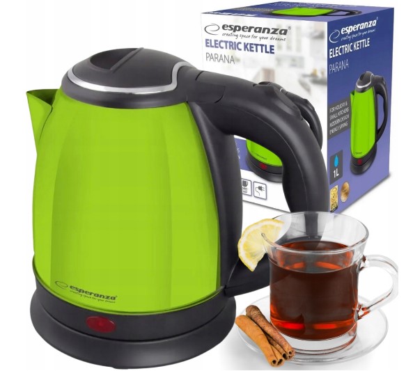 Електрочайник Esperanza Parana EKK128G — це зручний кухонний прилад, виконаний в кольорі Green. Завдяки об'єму 1 л та потужності 1350 Вт чайник швидко кип'ятить воду для 1–2 осіб, заощаджуючи час та енергію.